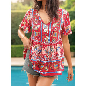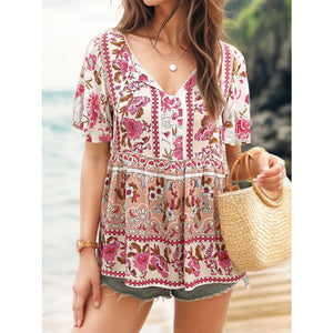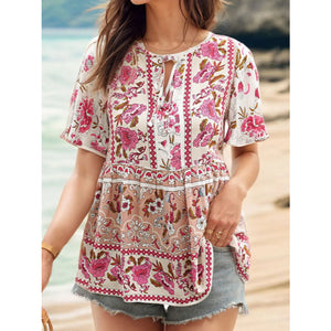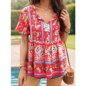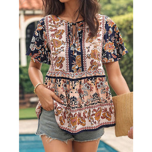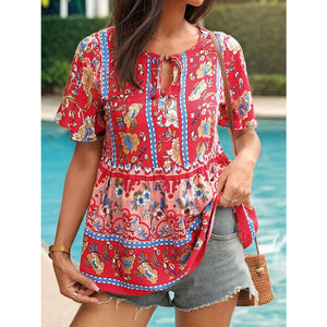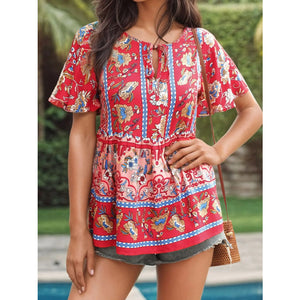 Floral Print Tie Neck Flutter Sleeve Blouse