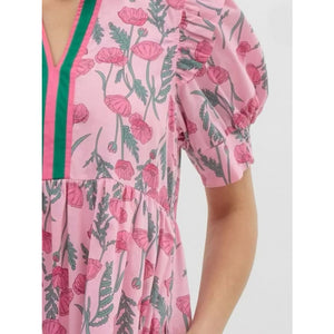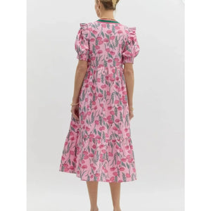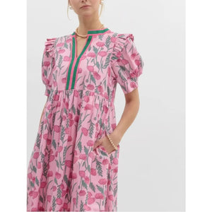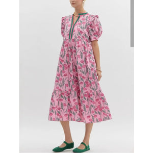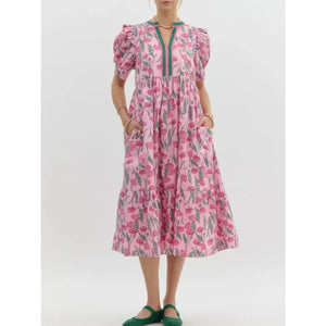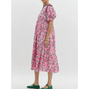 Floral Puff Sleeve Midi Dress with Contrast Trim