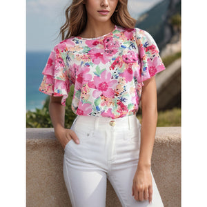 Floral Round Neck Flutter Sleeve Blouse