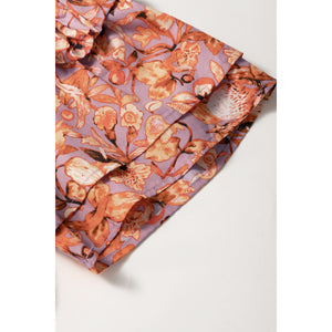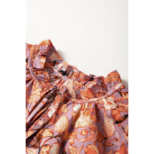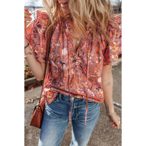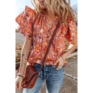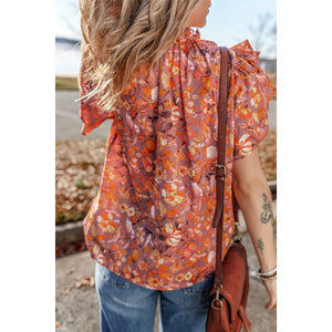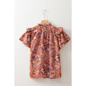 Floral Ruffled Layered Short Sleeve Tie Neck Blouse