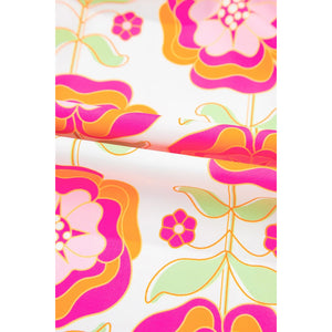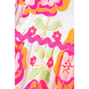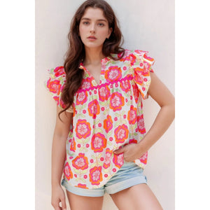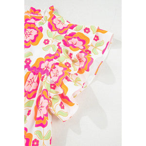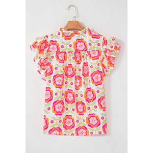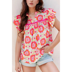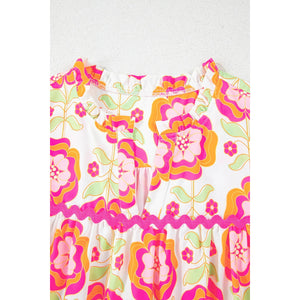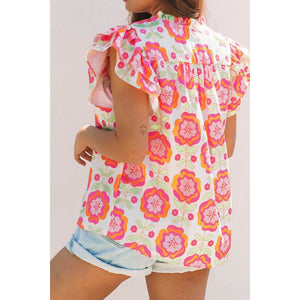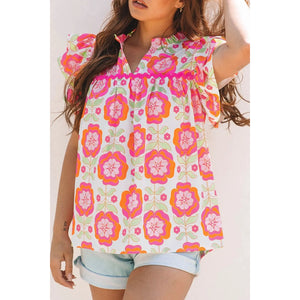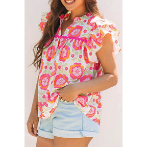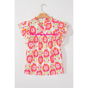 Floral Ruffled Sleeve Ric-Rac Trim Split Neck Loose Blouse