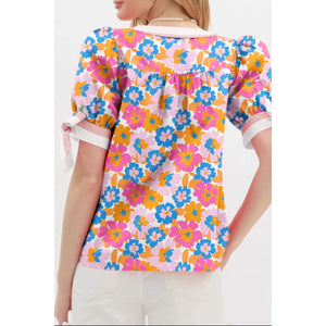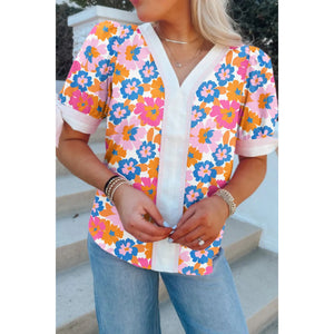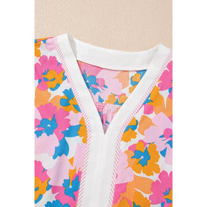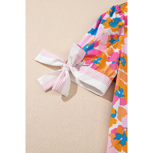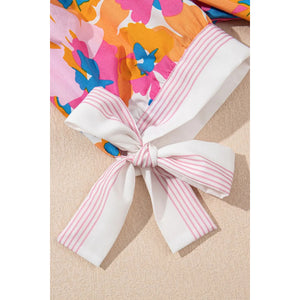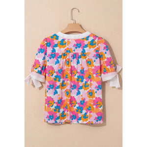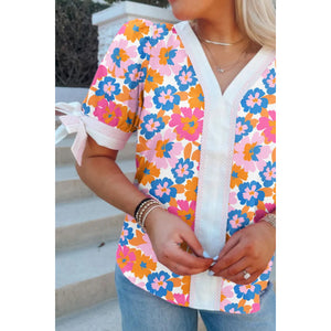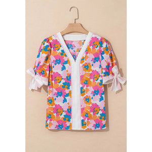 Floral Striped Edge V Neck Knotted Short Sleeve Blouse