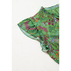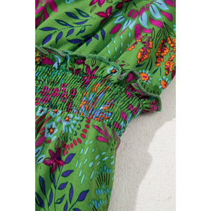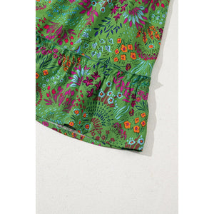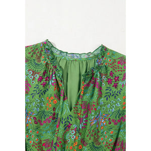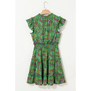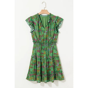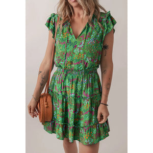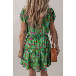 Floral Tie Split Neck Frilly Ruffle Trim Tiered Short Dress