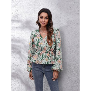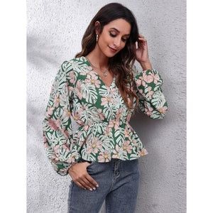 Floral V-Neck Balloon Sleeve Peplum Blouse