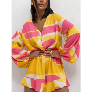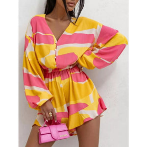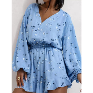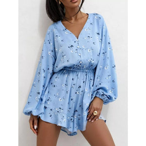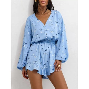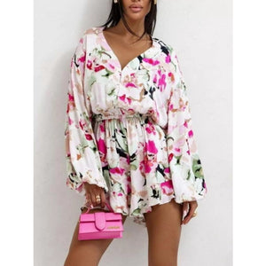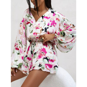 Floral V-Neck Long Sleeve Romper with Elastic Waist