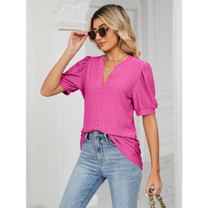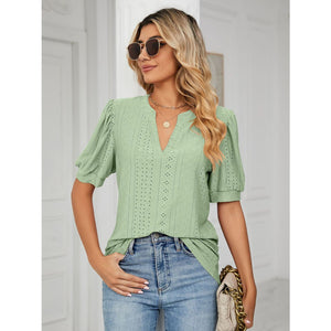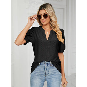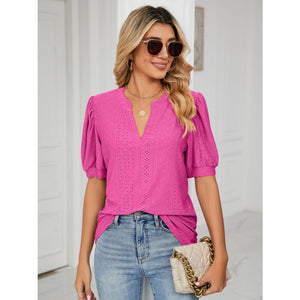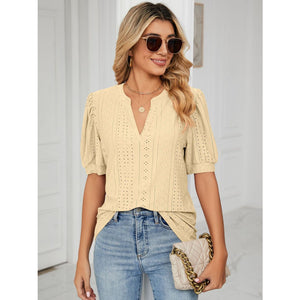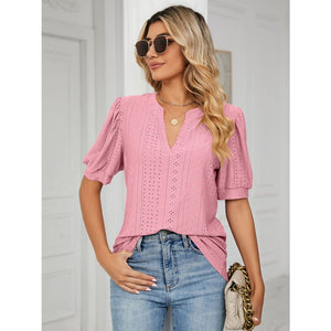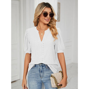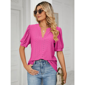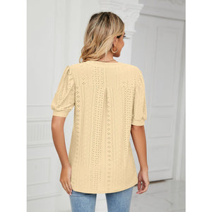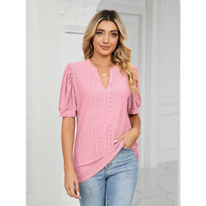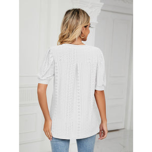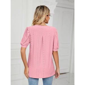 Florira Eyelet Notched Short Sleeve T-Shirt