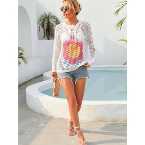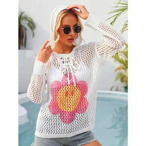 Flower Graphic Lace-Up Openwork Hooded Cover Up