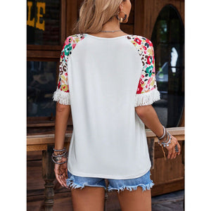 Fringe Round Neck Floral Half Sleeve T-Shirt