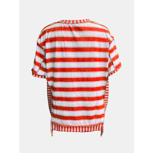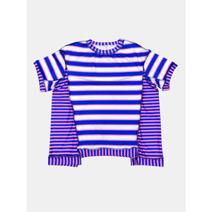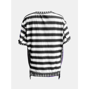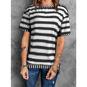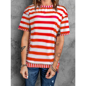 Full Size Contrast Stitching Striped Round Neck T-Shirt
