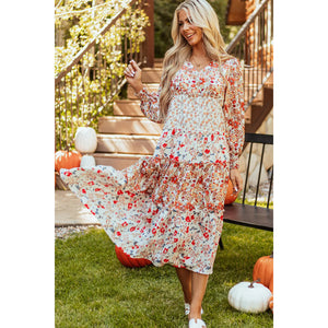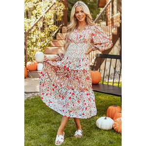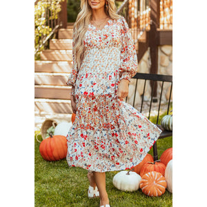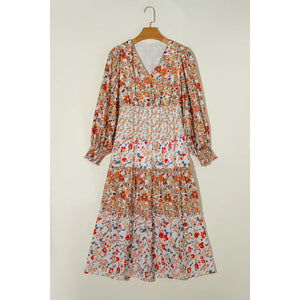 Full Size Printed V-Neck Lantern Sleeve Midi Dress