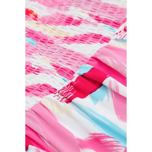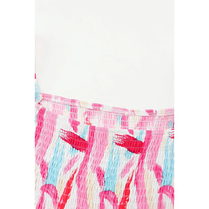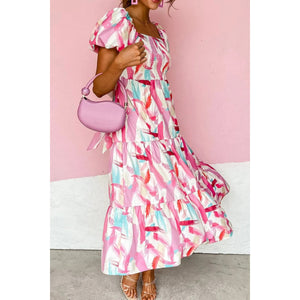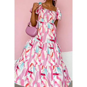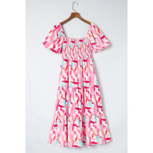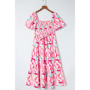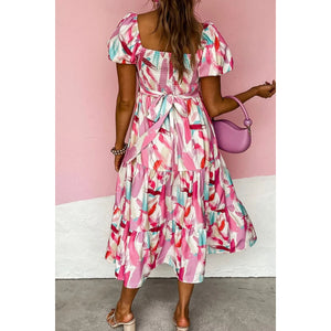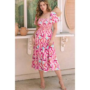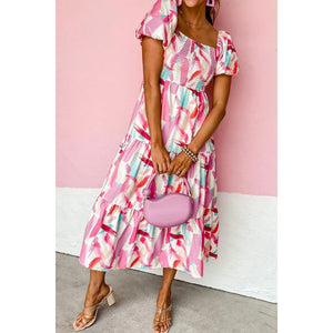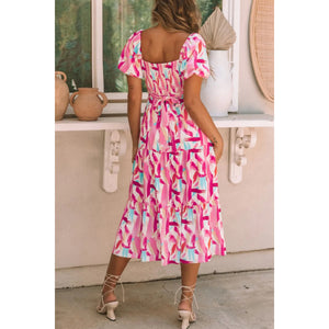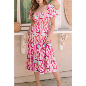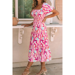 Geometric Print Puff Sleeve Square Neck Midi Dress