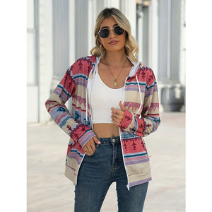 Geometric Zip Up Long Sleeve Hooded Jacket