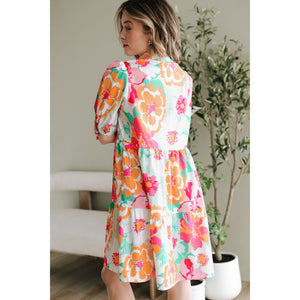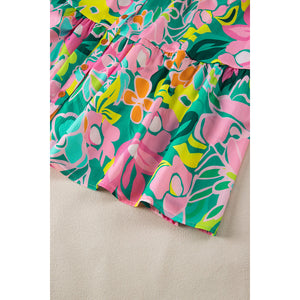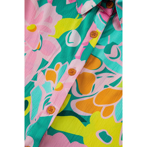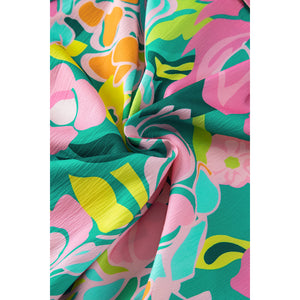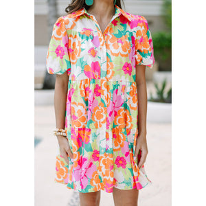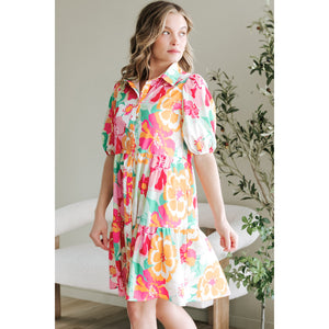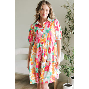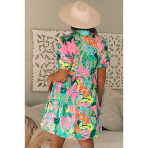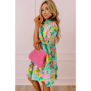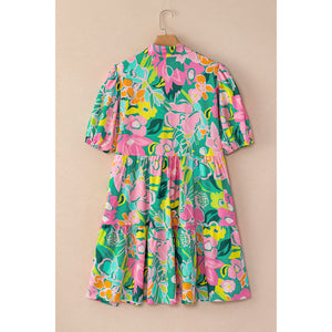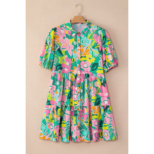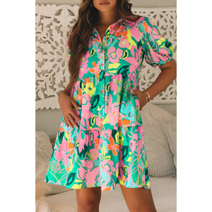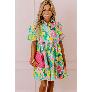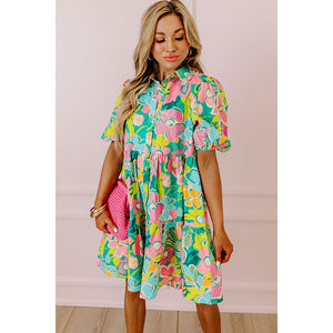 Green Floral Puff Sleeve Collar Buttoned Babydoll Dress