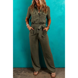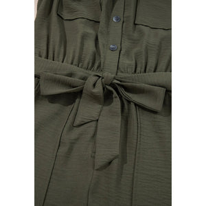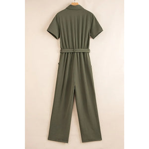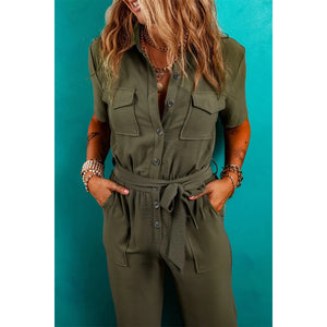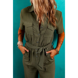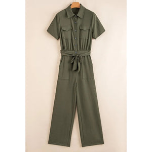 Half Button Belted Utility Short Sleeve Jumpsuit