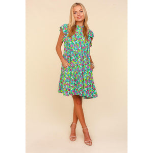 This frilled mock neck yoke dress features flutter short sleeves and a tiered knee-length design, creating a feminine and elegant silhouette. The ditzy small floral print adds a touch of charm and whimsy to the overall look. With side pockets for added convenience, this woven dress combines style with practicality. Perfect for a brunch date or a garden party, this dress exudes a romantic and chic vibe. Embrace a fresh and delightful style with this lovely piece that is sure to capture attention. Elevate your wardrobe with this tasteful and fashionable dress that offers both sophistication and functionality.