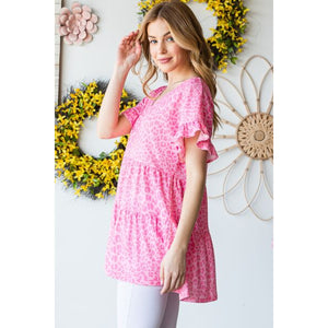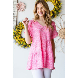 The Leopard Ruffle Trim Short Sleeve Top is a fierce and fashionable choice for any occasion. The leopard print adds a bold and trendy touch, while the ruffle trim adds a feminine and playful element. Pair it with jeans for a casual look or dress it up with a skirt for a night out.