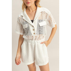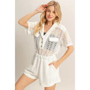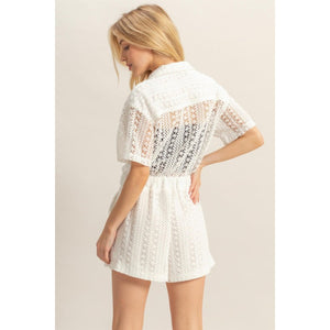 The Crochet Button Front Short Sleeve Romper is a charming and bohemian-inspired piece for your summer wardrobe. This romper features a delicate crochet design that adds a touch of whimsical texture to the look. The button front detail offers a vintage and feminine touch, while the short sleeves keep it light and airy. Perfect for a day at the beach or a casual outing, this romper is both stylish and comfortable, making it a versatile choice for the season.