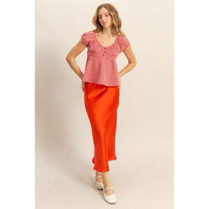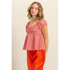 This blouse features a charming gingham pattern with a flattering scoop neck and cap sleeves for a feminine touch. The gingham print adds a classic and timeless appeal to the blouse, while the scoop neck and cap sleeves create a stylish and elegant look. Perfect for both casual and dressy occasions, this gingham blouse is a versatile and chic addition to your wardrobe for a polished and sophisticated ensemble.