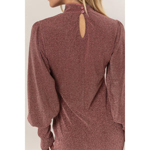 Get ready for a night to remember in this stunning figure-hugging dress! Crafted from glitter knit fabric, it offers a touch of sparkle that catches the light beautifully. The midi silhouette flatters the figure, while the mock neck and bishop sleeves add an elegant touch. A back button closure with a keyhole cutout enhances its chic design, making it perfect for any special occasion. Whether you're heading to a party or a romantic dinner, this dress is sure to make a statement!