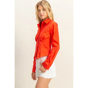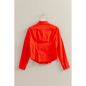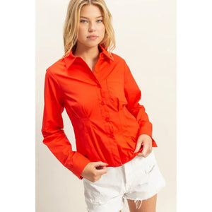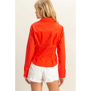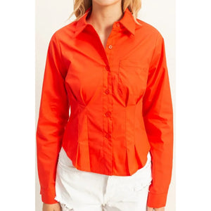 Add a touch of elegance to your wardrobe with this Long Sleeve Pleated Waist Poplin Shirt. The pleated waist detail creates a flattering silhouette that exudes sophistication. The long sleeves offer versatility for both casual and formal occasions. The poplin fabric provides a crisp and polished look, perfect for adding a touch of refinement to your outfit. Pair this shirt with tailored pants or a skirt for a classic and stylish ensemble that is perfect for the office or a dinner out.