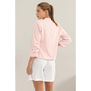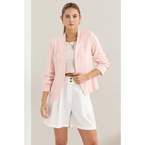 The Open Front Ruched Sleeve Blazer is a sophisticated and stylish outerwear option. With its open front design, this blazer offers a chic and versatile look that can easily transition from day to night. The ruched sleeves add a touch of elegance and flair to the classic blazer silhouette. Perfect for adding a polished touch to any outfit, this blazer is a must-have for your professional wardrobe. Whether for a formal event or a casual outing, this blazer is sure to elevate your style. Make a fashion statement with the Open Front Ruched Sleeve Blazer and exude confidence and sophistication wherever you go!