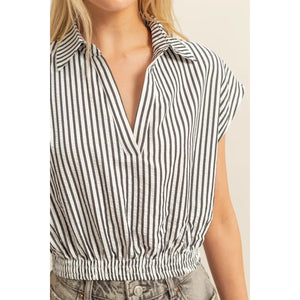 HYFVE Striped Elastic Hem Johnny Collar Cap Sleeve Blouse