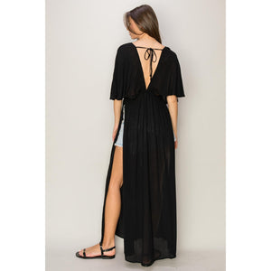 Catch That Special Someone Staring When You Walk In Wearing This Cover-Up Dress. It Has A Plunging Neck, Batwing Sleeves, And A Tie Detail At The Back. A Cinched Waist Draws Attention To Your Curves, Dropping Into A Flowy Maxi Skirt With Long Side Slits.