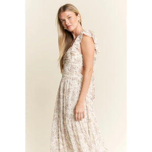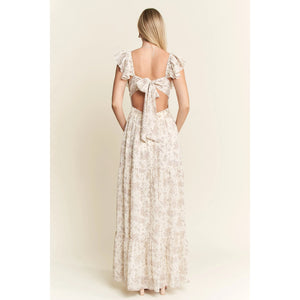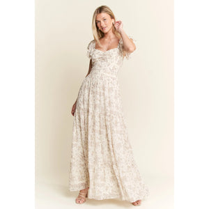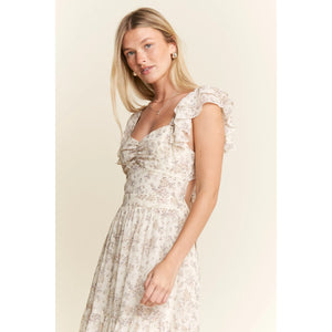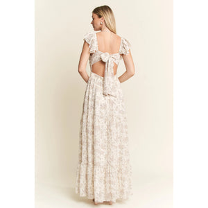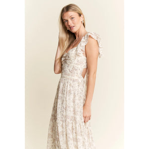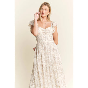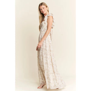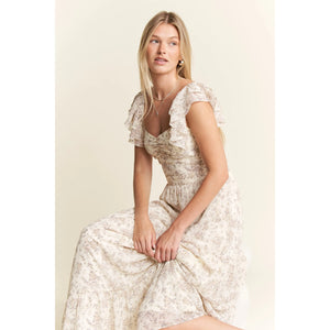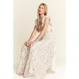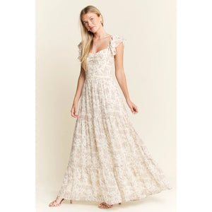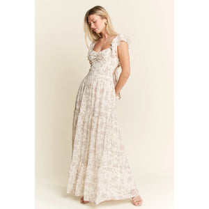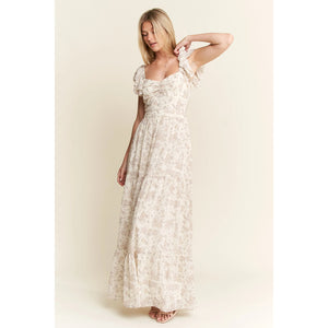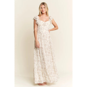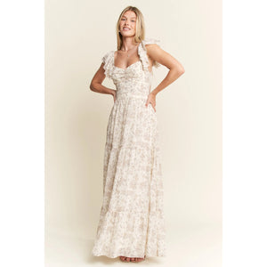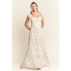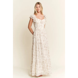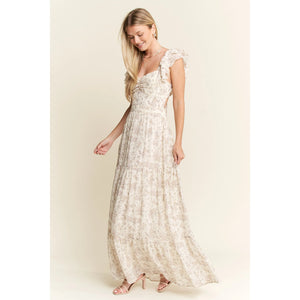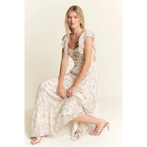 This enchanting maxi dress features a delicate floral print on a light, flowing fabric. The romantic design includes flutter cap sleeves with feminine ruffle details and a flattering sweetheart neckline. The empire waist creates an elegant silhouette, while the tiered maxi-length skirt adds movement and grace. Made from soft, breathable material perfect for warm weather occasions. The neutral beige and white color scheme makes it versatile for various events from garden parties to beach weddings. The dress combines classic feminine elements with contemporary bohemian style.
