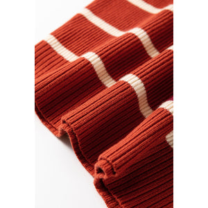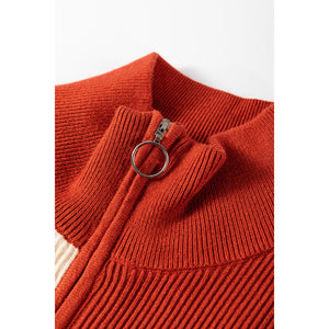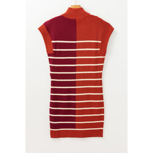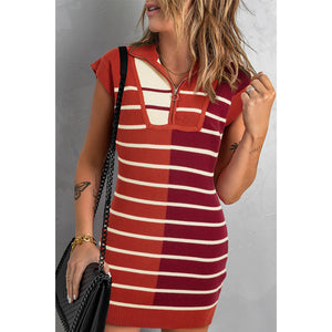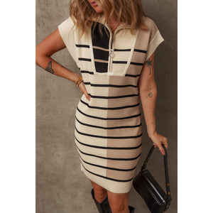 Khaki Stripe Color Block Quarter Zip Collar Short Sleeve Sweater Dress