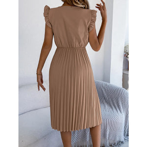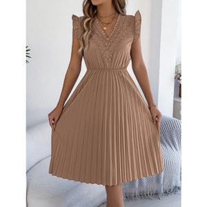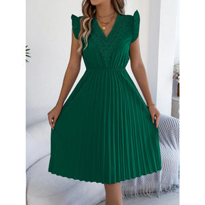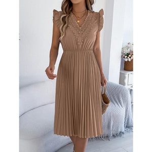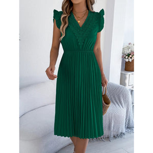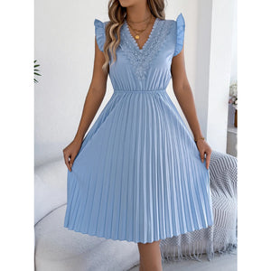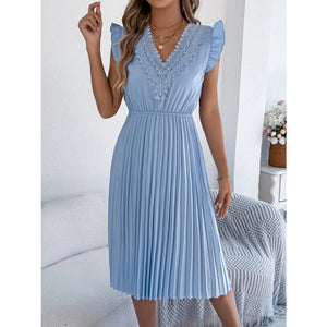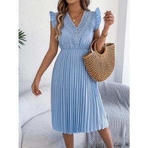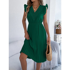 Lace Detail Ruffled Cap Sleeve Pleated Dress