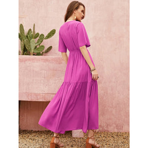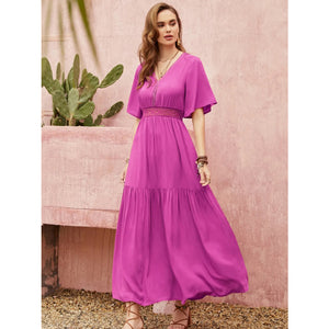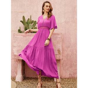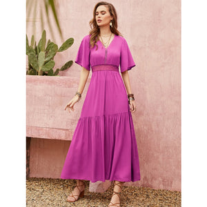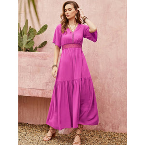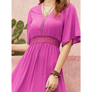Lace Detail V-Neck Short Sleeve Midi Dress