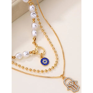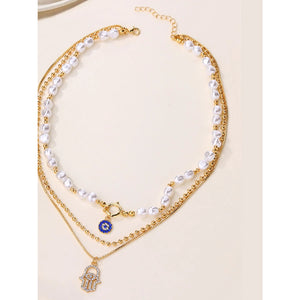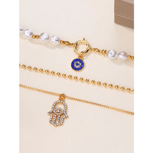 Layered Pearl Chain Evil Eye Hamsa Pendant Necklace