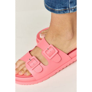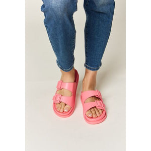 The double buckle open toe sandals are a trendy and stylish footwear option for warm weather. These sandals feature two adjustable buckles for a comfortable and secure fit, while the open toe design allows for breathability. With a versatile look that can be dressed up or down, these sandals are perfect for adding a fashion-forward touch to any outfit.