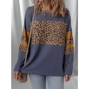 Leopard Color Block Long Sleeve Drop Shoulder Top