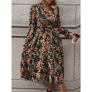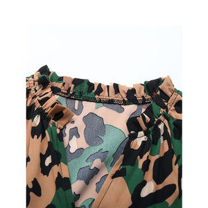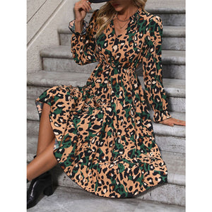 Leopard Notched Flounce Sleeve Midi Dress
