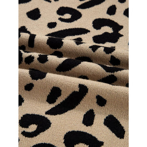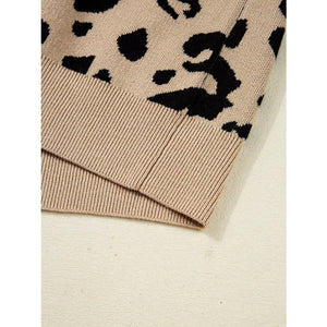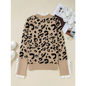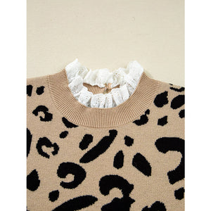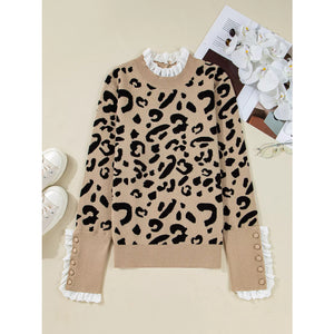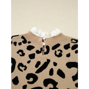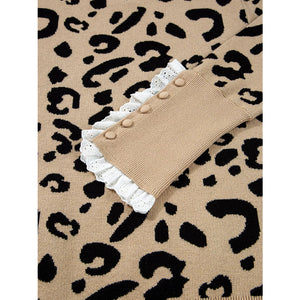 Leopard Pattern Lace Ribbed Detail Button Cuffed Sweater