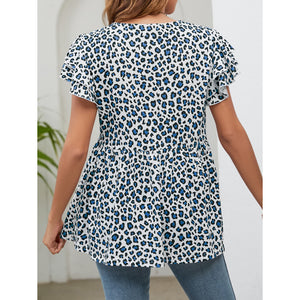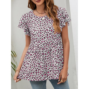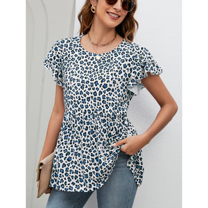 Leopard Round Neck Flutter Sleeve Babydoll Blouse