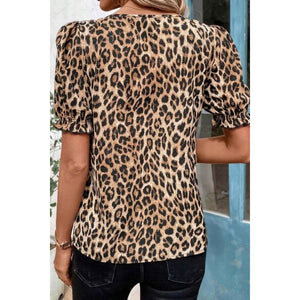 Leopard Ruffled Neck Cascading Puff Short Sleeve Top