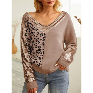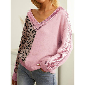 Leopard Sequin V-Neck Long Sleeve Sweater