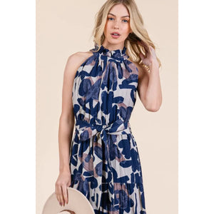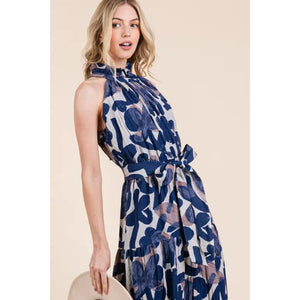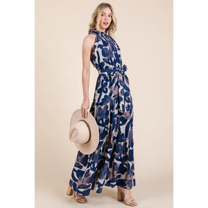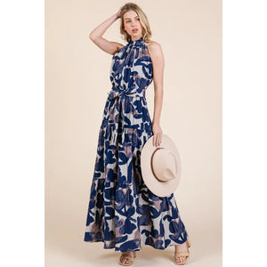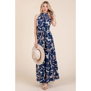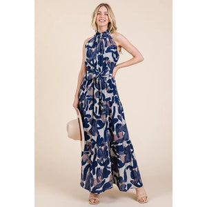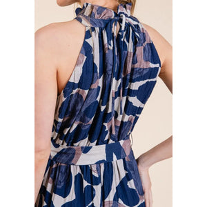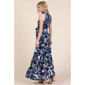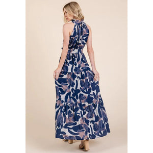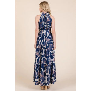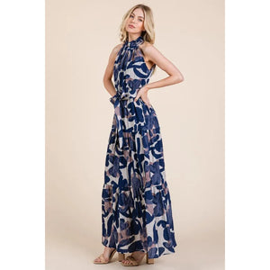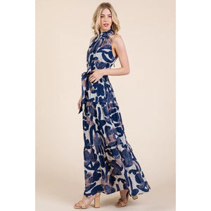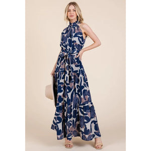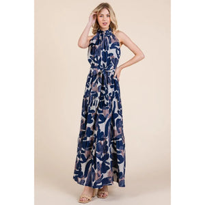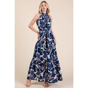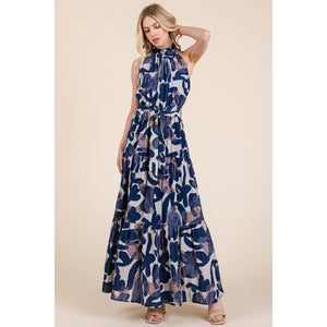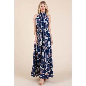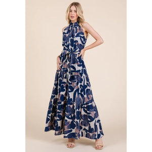 Make a statement in this abstract halter neck tie-waist tiered maxi dress. The abstract print adds a modern and artistic flair to the dress. The halter neck design is elegant and perfect for showcasing your shoulders. The tie-waist detail defines the waist for a flattering silhouette. Elevate your outfit with this striking and stylish maxi dress.