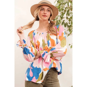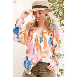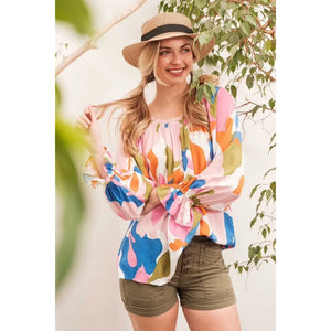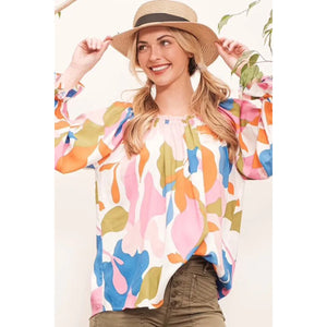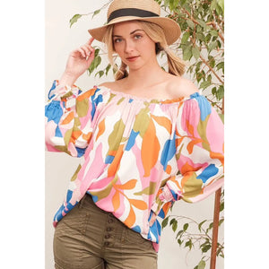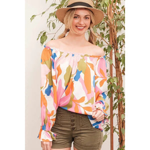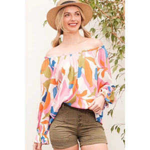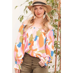 Make a bold statement with this abstract print off-the-shoulder long sleeve top. The abstract print adds a modern and artistic touch to the top. The off-the-shoulder design is chic and trendy, perfect for showcasing your shoulders. Pair with jeans or trousers for a stylish and fashion-forward look. Elevate your outfit with this unique and eye-catching top.