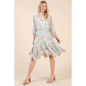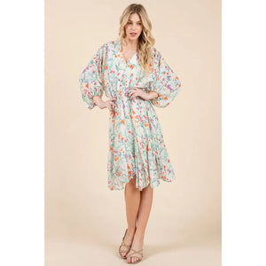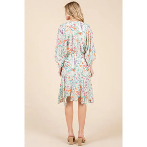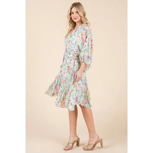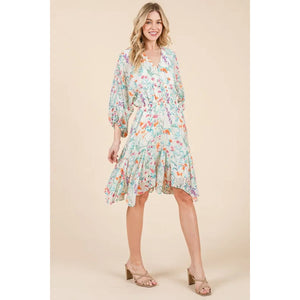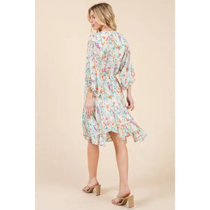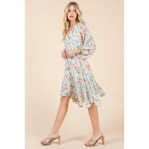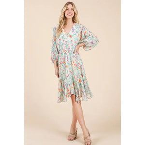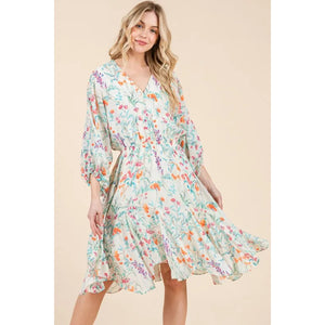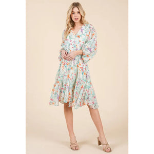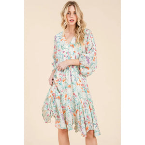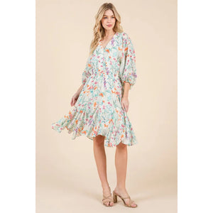 Lime 'N' Chili Floral Cinched Waist Balloon Sleeve V-Neck Dress