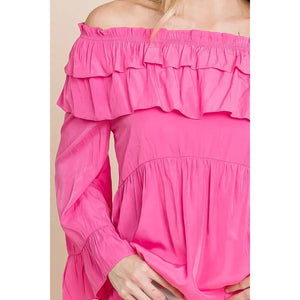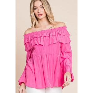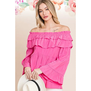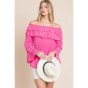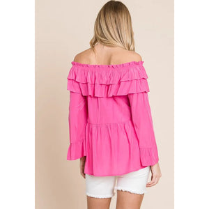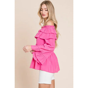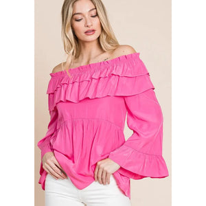 Make a statement in this solid ruffled trumpet sleeve off-the-shoulder top. The trumpet sleeves add a touch of drama and flair to the top. The off-the-shoulder neckline is feminine and on-trend. The ruffled detailing creates a romantic and playful look. Pair with jeans or a skirt for a stylish and chic outfit. Embrace a fashion-forward style with this trendy and versatile top.