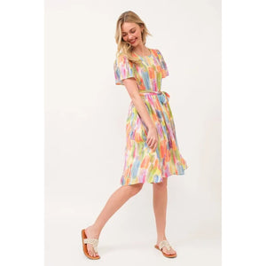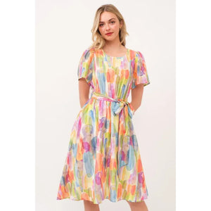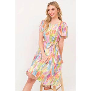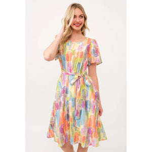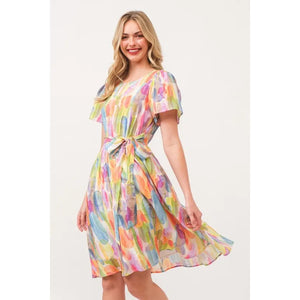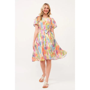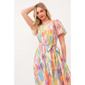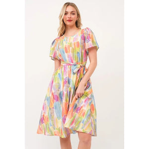 Make a statement in this watercolor print tie front midi dress. The beautiful watercolor print creates a unique and artistic look. The tie front detail adds a flattering touch and allows for a customizable fit. Perfect for a summer day out or a special occasion. Pair with sandals or heels for a stylish and effortless outfit. Embrace a chic and feminine style with this stunning midi dress.