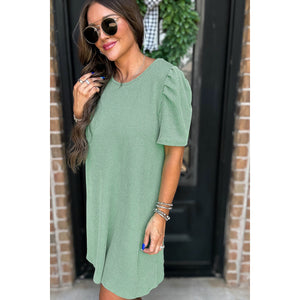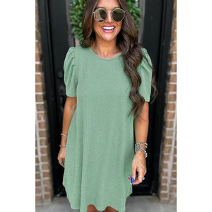 Mint Green Corded Knit Crew Neck Puff Sleeve Shift Mini Dress