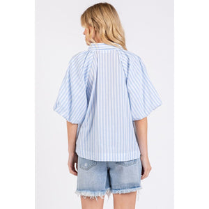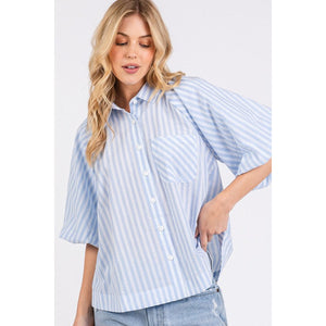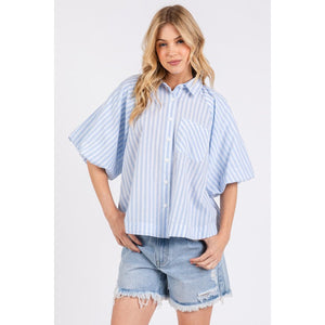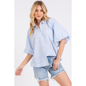 This button-down shirt features chic stripes and statement puff sleeves for a trendy and sophisticated look. The classic stripe pattern adds a timeless touch to the shirt, while the puff sleeves create a dramatic and fashion-forward silhouette. Perfect for adding a stylish twist to your outfit, this shirt can be dressed up or down for various occasions. The button-down front allows for versatile styling options, making it easy to transition from day to night. Elevate your wardrobe with this button-down striped puff sleeve shirt that combines classic charm with contemporary flair.