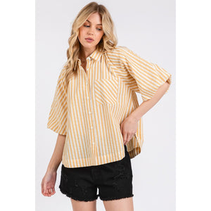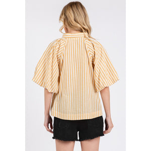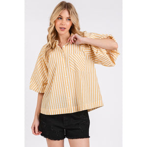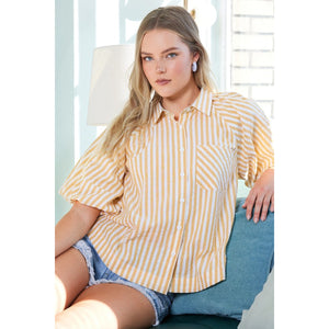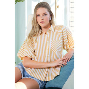 This button-down shirt features chic stripes and statement puff sleeves for a trendy and sophisticated look. The classic stripe pattern adds a timeless touch to the shirt, while the puff sleeves create a dramatic and fashion-forward silhouette. Perfect for adding a stylish twist to your outfit, this shirt can be dressed up or down for various occasions. The button-down front allows for versatile styling options, making it easy to transition from day to night. Elevate your wardrobe with this button-down striped puff sleeve shirt that combines classic charm with contemporary flair.
