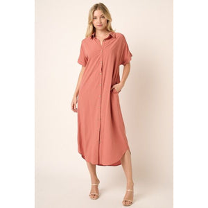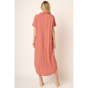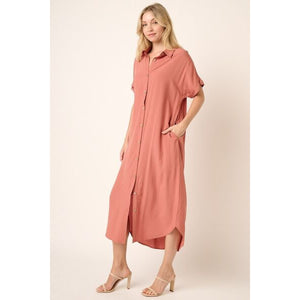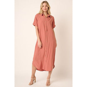 The Collared Neck Dolman Short Sleeve Midi Shirt Dress is a stylish and versatile piece that offers a modern twist on a classic silhouette. With a collared neckline and dolman-style short sleeves, this dress combines sophistication with laid-back ease. The midi length adds a touch of elegance, making it suitable for both casual outings and more formal occasions. Pair this shirt dress with flats for a relaxed daytime look or dress it up with heels and statement accessories for a chic ensemble.