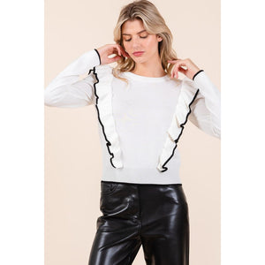 The Contrast Trim Ruffled Round Neck Knit Top combines a classic round neck design with stylish ruffled detailing and contrasting trim. The ruffles add a feminine touch to the top, while the contrast trim adds visual interest and a modern twist. The knit fabric ensures comfort and a versatile look that can be dressed up or down for various occasions.