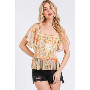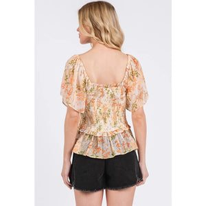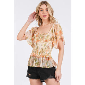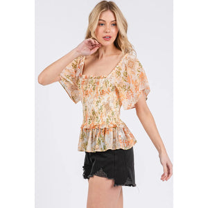 Mittoshop Floral Chiffon Smocked Square Neck Peplum Top